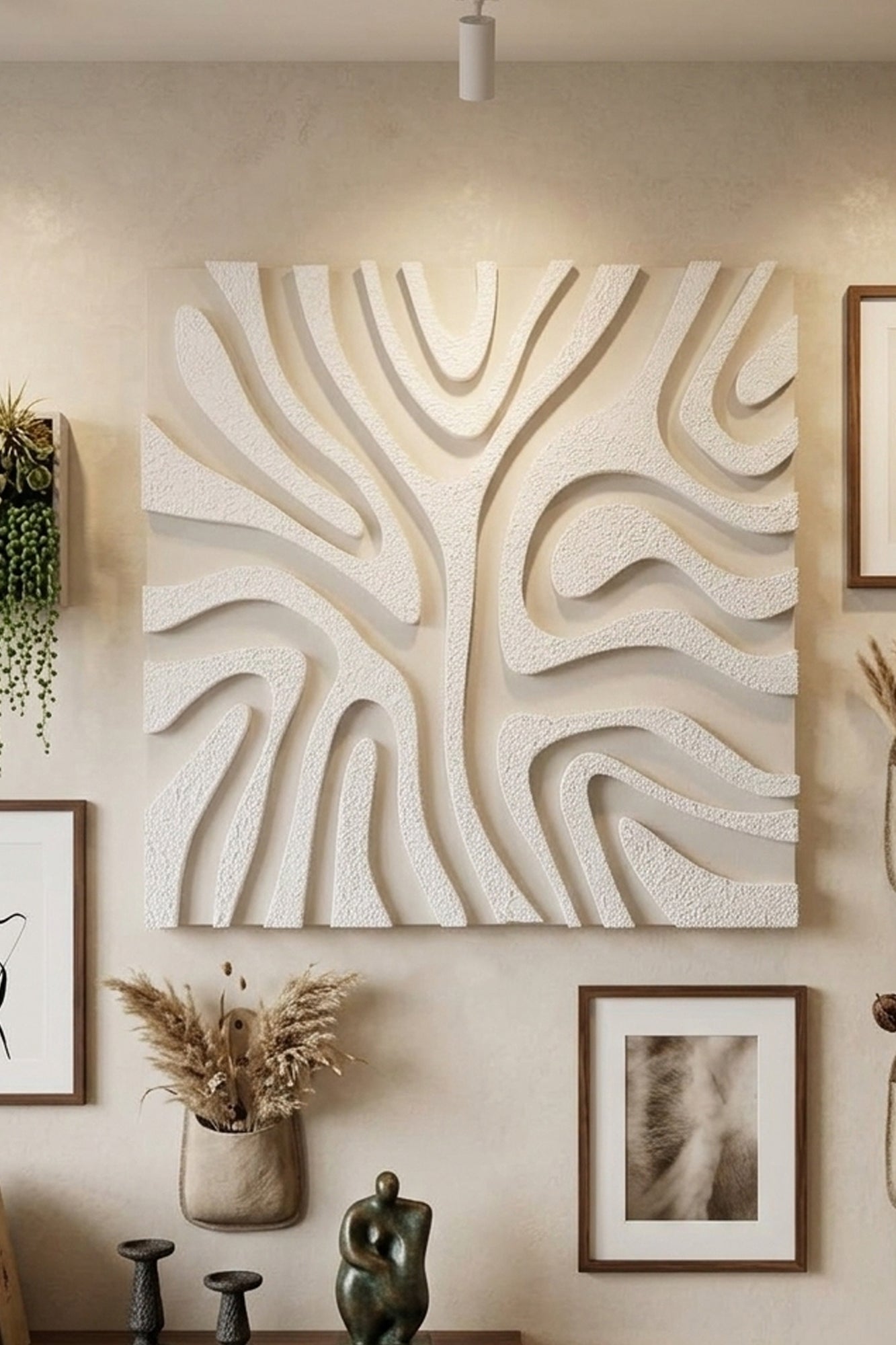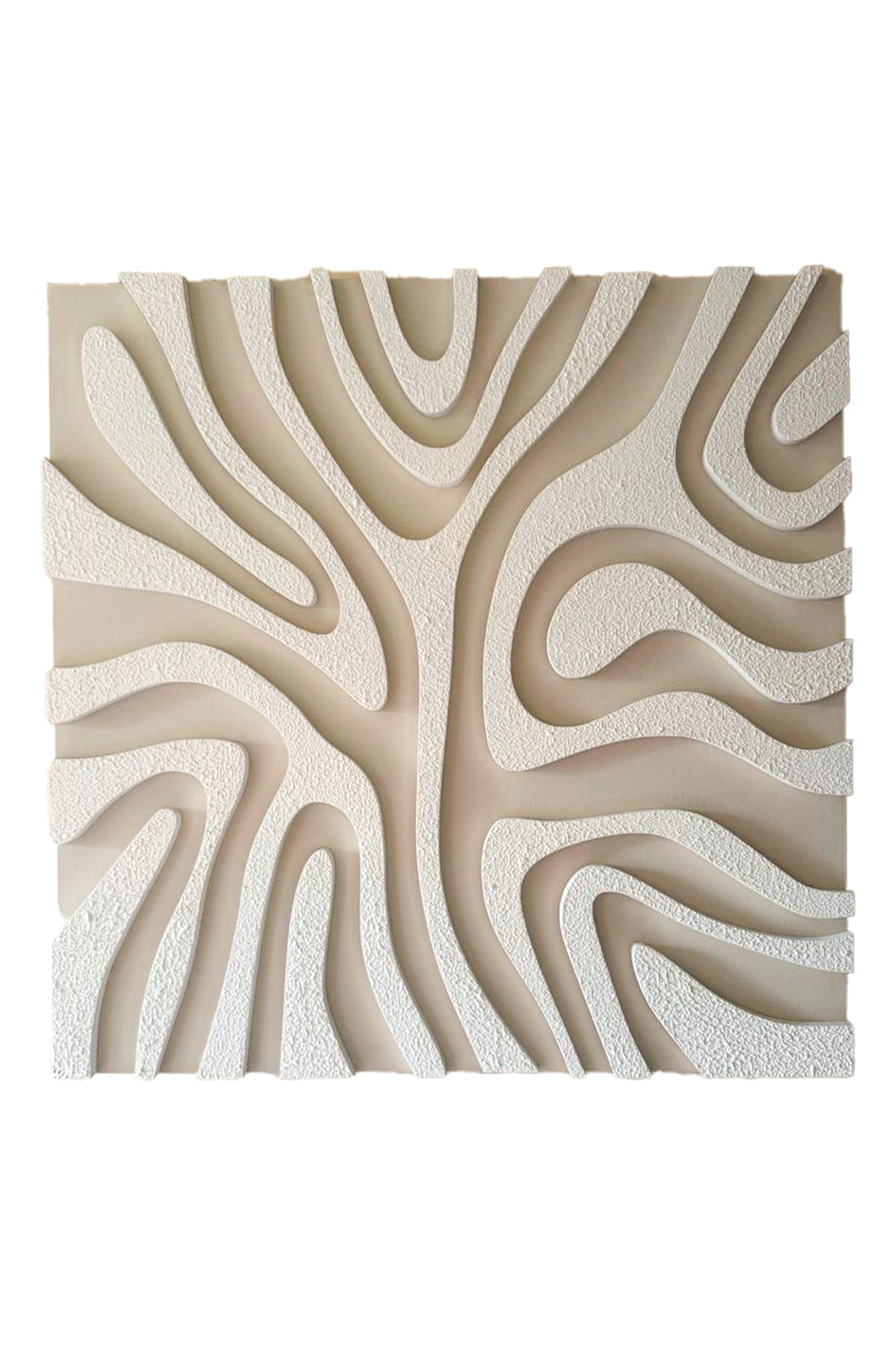 This is a striking modern 3D textural relief art piece in a square format, mounted on a...